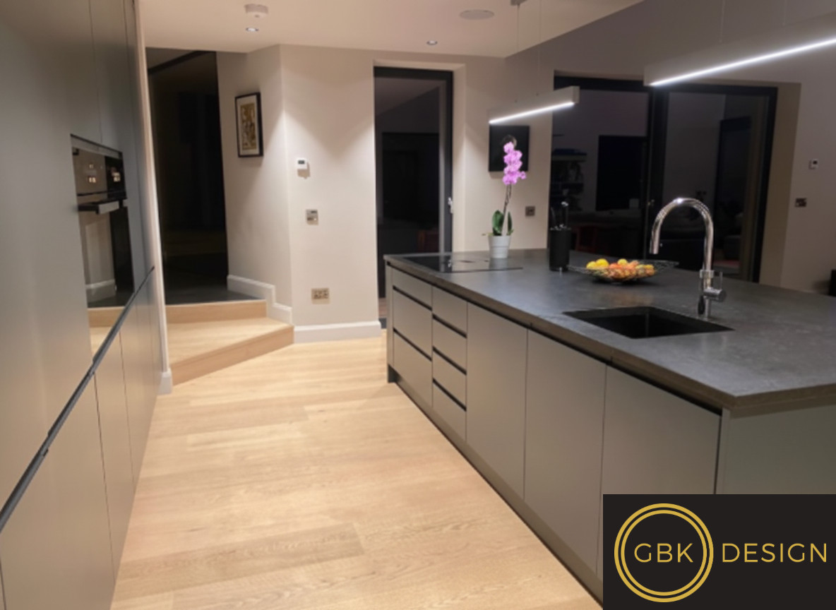The graphite elegance kitchen defines understated luxury. Sleek J-Pull handleless doors in graphite create a modern silhouette, perfectly balanced by Belgian Blue soft-touch quartz with a 30mm bevel edge. Every surface reflects GBK Design’s commitment to refinement and function.