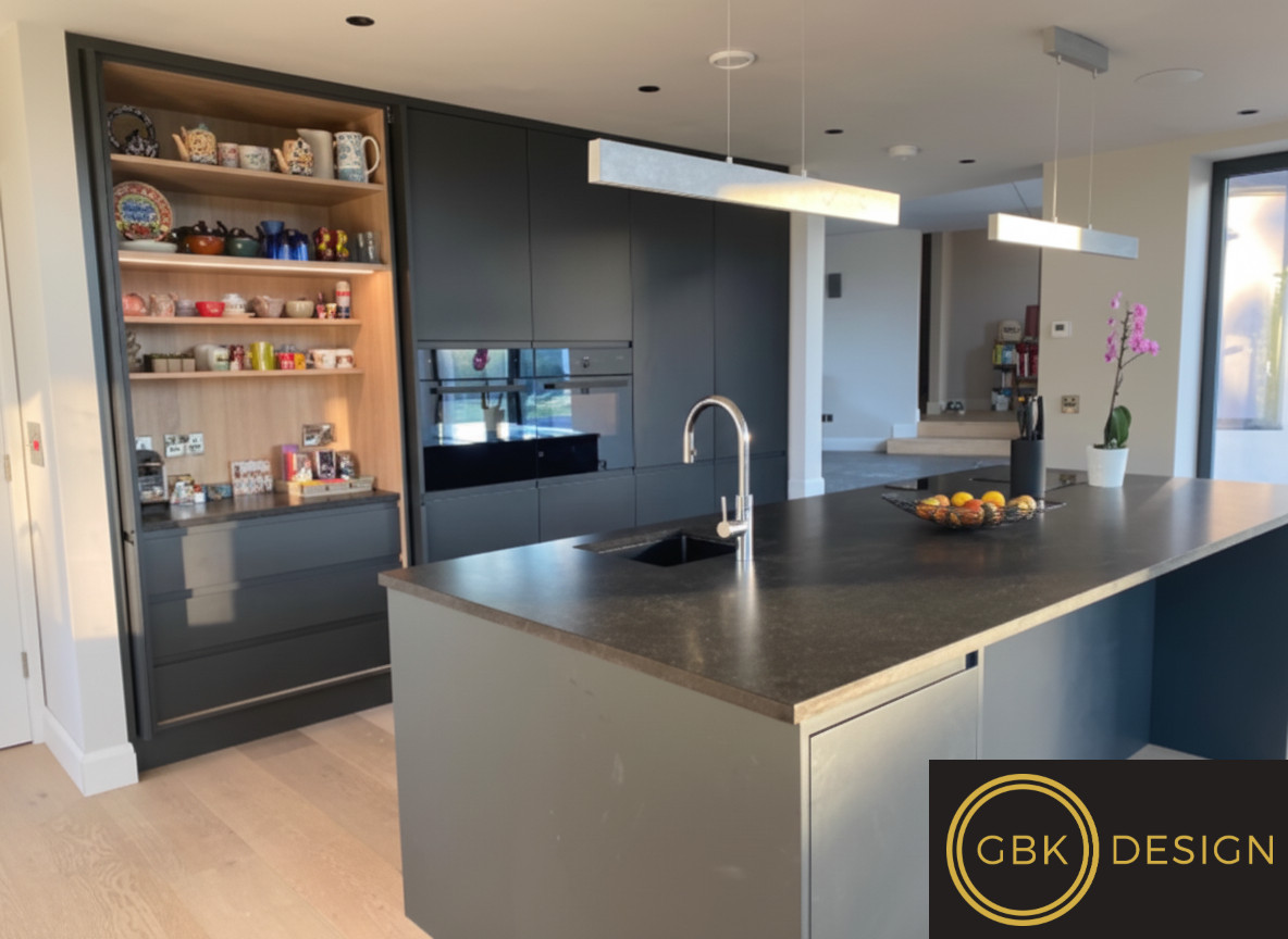A statement 1200mm double pocket-door pantry and a Quooker tap add intelligent sophistication to this graphite elegance kitchen. Designed and fitted by GBK Design with quartz supplied by Stone Solutions in Wexford, this luxury fitted kitchen embodies timeless modern craftsmanship for the discerning homeowner.