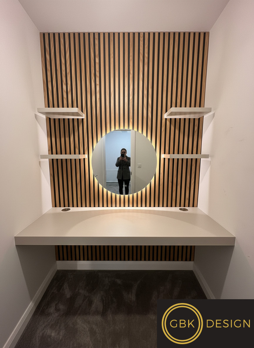 A taupe and oak dressing room with latted panels, ambient lighting and bespoke detailing, designed to bring beauty, elegance and indulgence into everyday life.