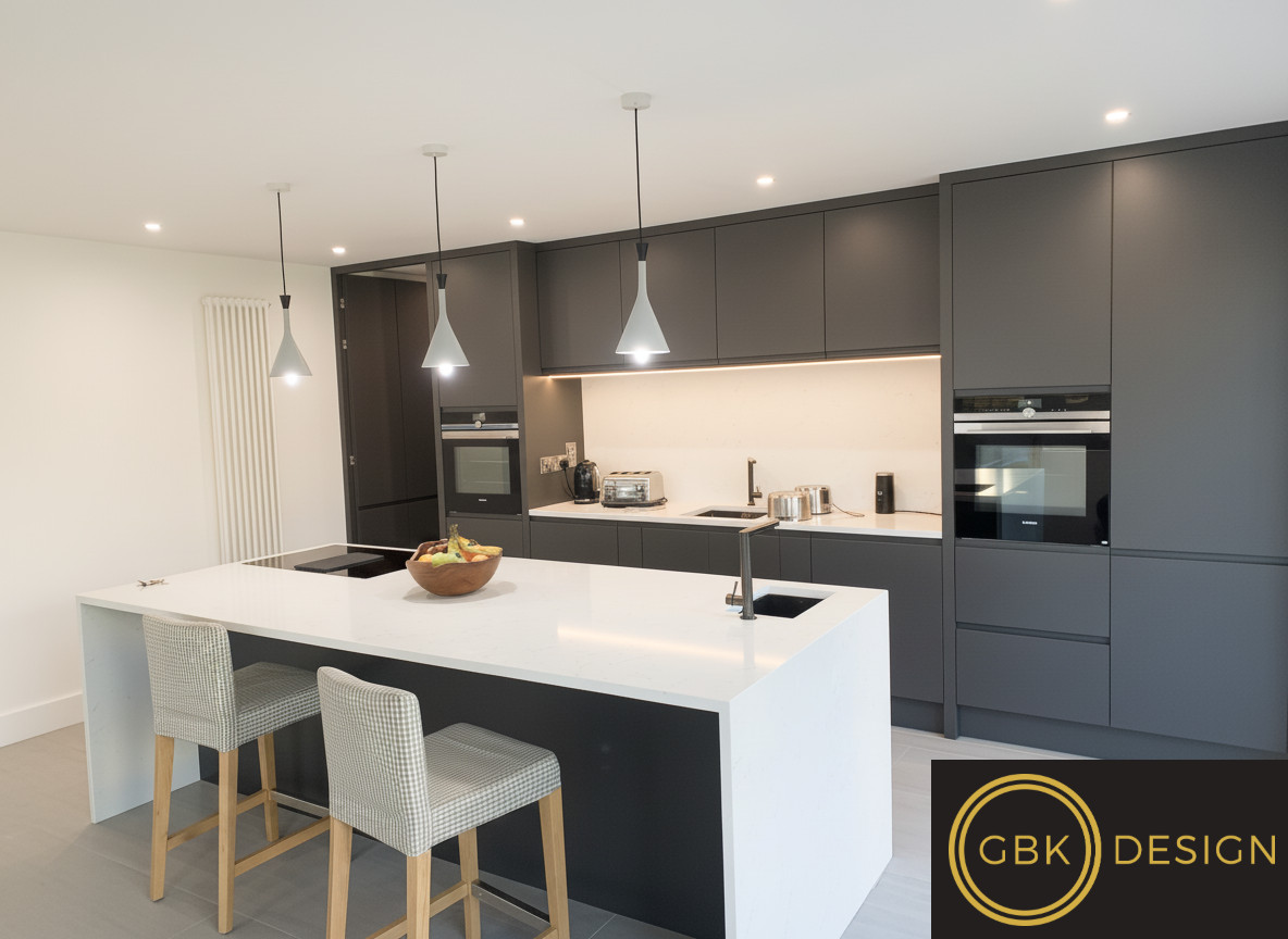 A sleek fusion of contemporary design and practical innovation, this minimalist fitted kitchen exudes sophistication with graphite cabinetry, quartz worktops, and discreet detailing that elevates everyday living into pure luxury.